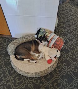 Riesling will be greatly mourned and missed as she was her Mom’s soulmate dog, her Dad’s Sweetest dog of his life, and certainly meant much to 1,000’s of other people she crossed paths with throughout her short 7 years of life. At four months of age, she fell into the role as the lobby pup at Hotel Stebbins and lovingly, sweetly and entertainingly maintained that role until the day she passed. The familiar view of her sitting in the lobby bay window as guests drove up to check in or as passerby’s giggled at her perched there so proper, will be missed by many. The impact she had on so many people is truly amazing and we are proud, as her parents, to have been able to facilitate her role here on earth.